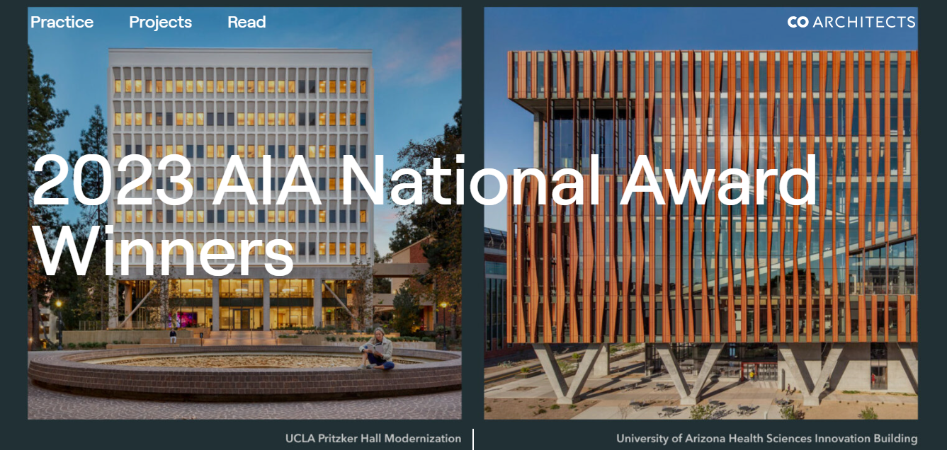 What captures our attention: Demonstrating expertise and credibility is paramount, and CO Architect does this remarkably by prominently showcasing their awards. Upon arrival, visitors are greeted with the bold declaration of their 2023 AIA National award, presented in white font against a backdrop that highlights two of the brand’s impressive projects.